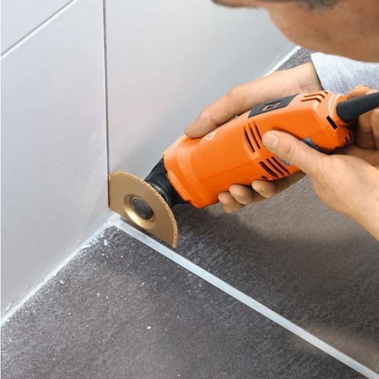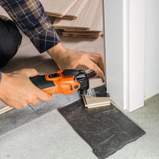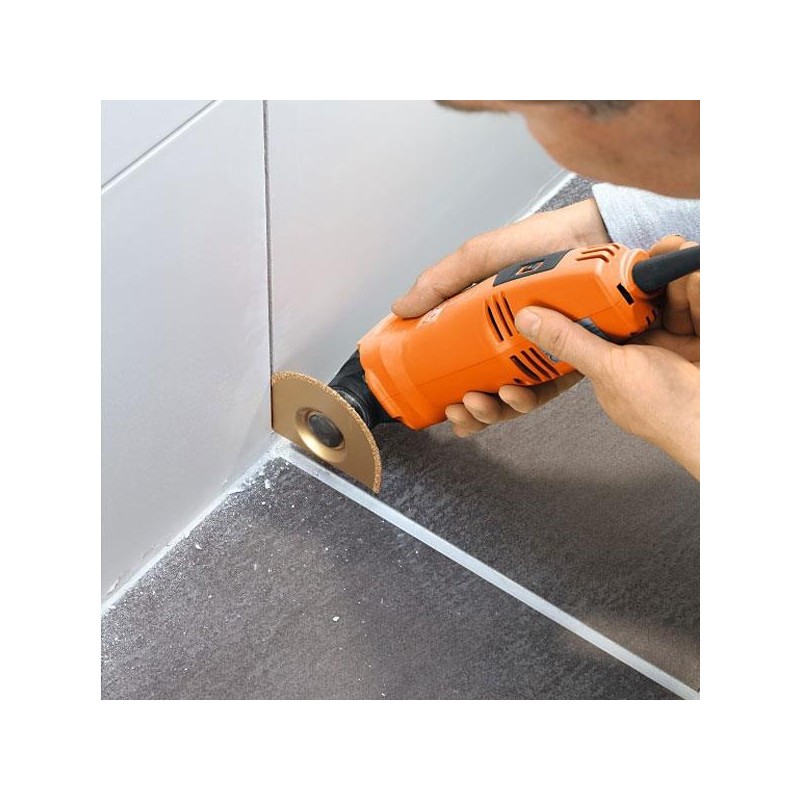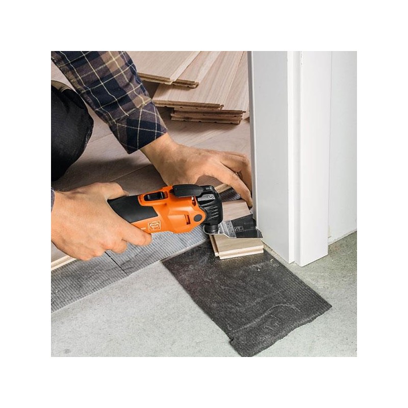 Livré dans un coffre de rangement avec plus de 30 accessoires pour scier dans du bois, métal et plastique, pour la dépose de carrelage, joints en silicone et moquettes, pour éliminer des restes de colle et pour enlever la colle à carreaux.
